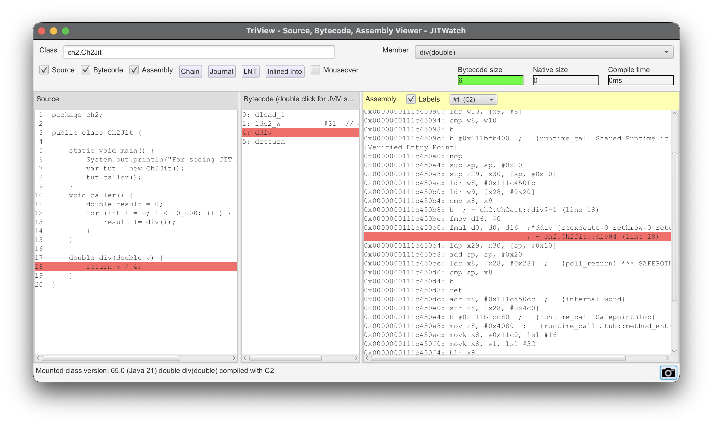 work % java -XX:+UnlockDiagnosticVMOptions \ "-XX:CompileCommand=print,ch2.Ch2Jit::div" \ -cp src ch2.Ch2Jit