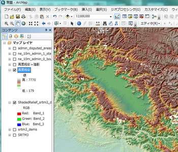 3秒(90m)間隔の数値標高データをArcMapに読み込ませます。SRTM3は1度四方の単位のファイル(hgt形式)で、ArcMapでは標準で読み込み可能です。読み込むとデフォルトでそのファイル内の最小値・最大値を上下限とする白黒のカラーマップが適用1されます。複数のファイルを読み込むと、ファイルごとに標高の最小値・最大値が異なるので以下の画面のようになります。