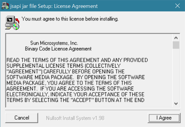 アーカイブを展開しただけではjsapi.jarが生成されません。展開後、lib\jsapi.exeを管理者権限で実行します。実行するとライセンスに同意するか聞かれるダイアログが表示されるので[I Agree]を押します。するとjsapi.jarファイルが生成されます。この場所にファイルを作成するには管理者権限が必要です。