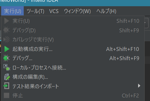 一度実行するファイル(クラス)が選択されると、[実行]メニューの[実行]が活性化されます。次からは[実行]メニューからも実行できるようになります。