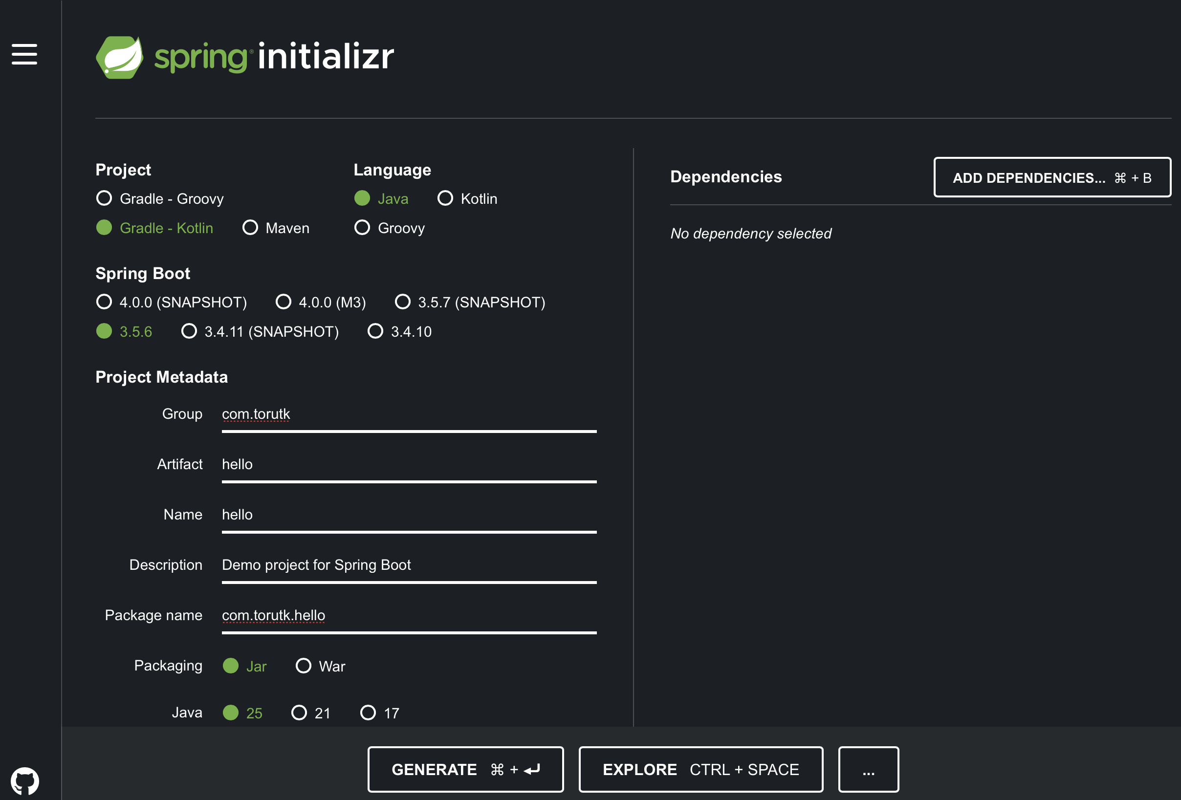 手動で https://start.spring.io にアクセスして設定を指定してプロジェクトの雛形を取得することもできます。Webブラウザでアクセスし必要な設定を記述します。